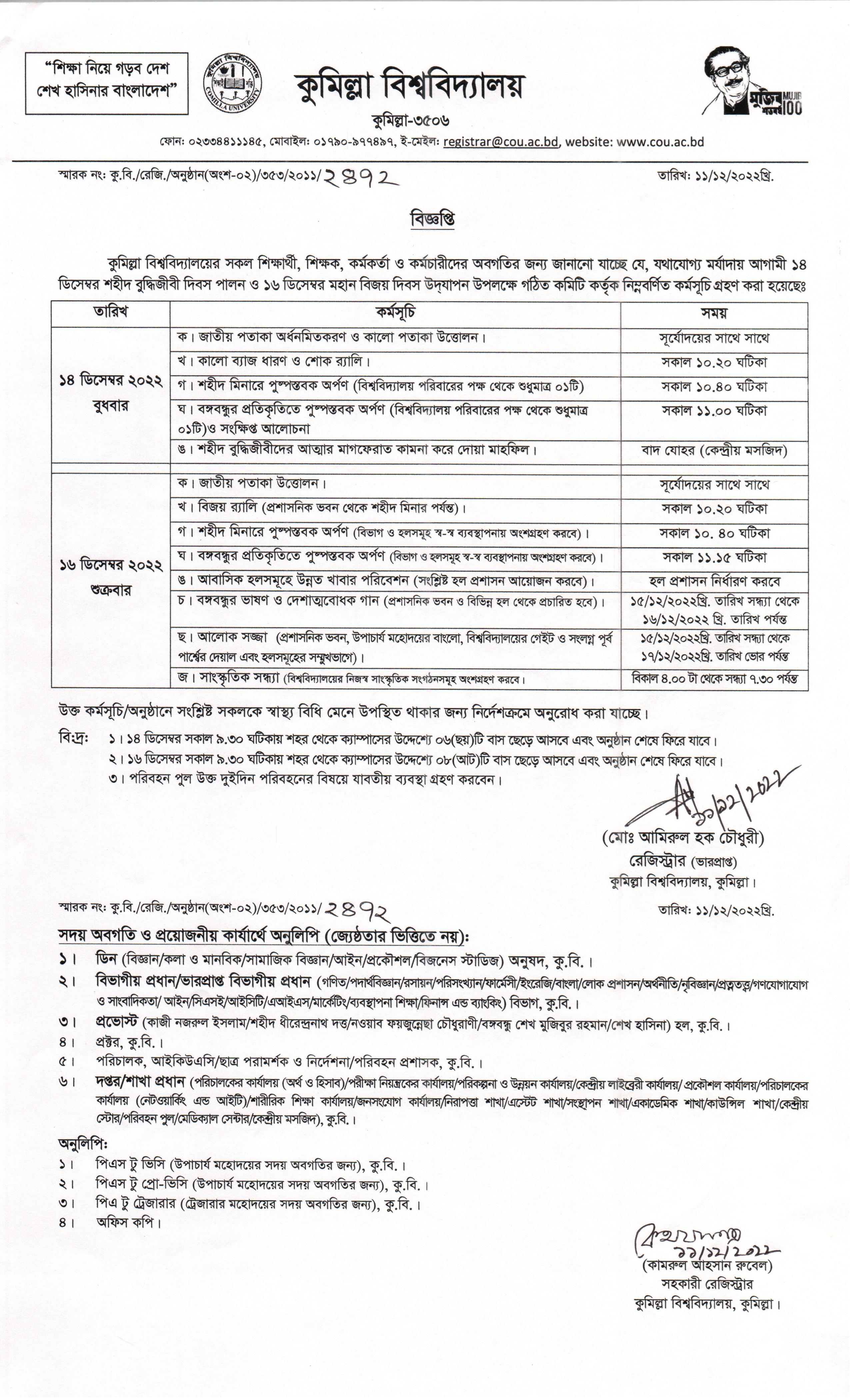 বিজ্ঞপ্তি (আগামী ১৪ ডিসেম্বর শহীদ বুদ্ধিজীবী দিবস পালন ও ১৬ ডিসেম্বর মহান বিজয় দিবস উদ্যাপন উপলক্ষে গৃহীত কর্মসূচি)