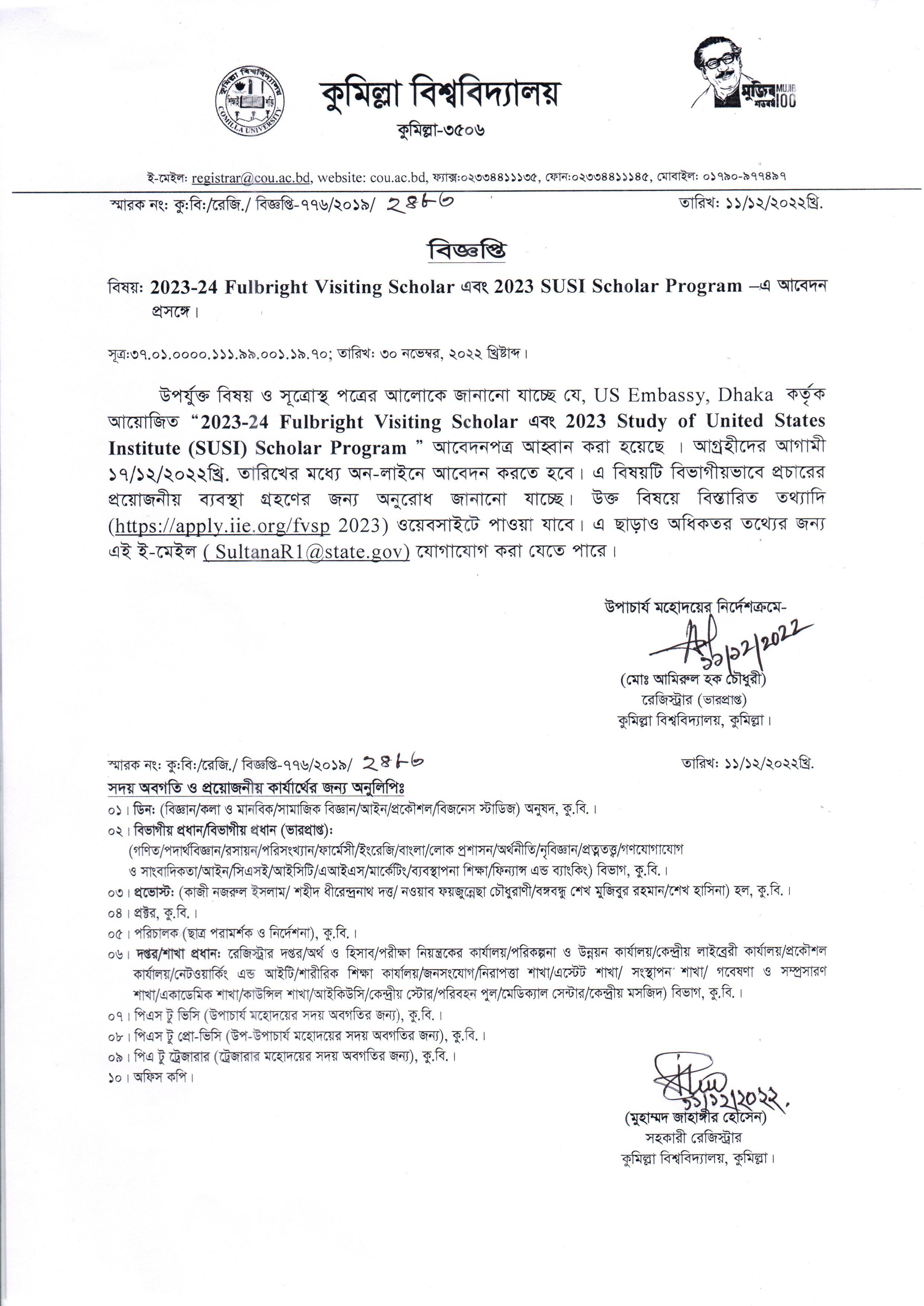 বিজ্ঞপ্তি (2023-24 Fulbright Visiting Scholar এবং 2023 SUSI Scholar Program –এ আবেদন প্রসঙ্গে)